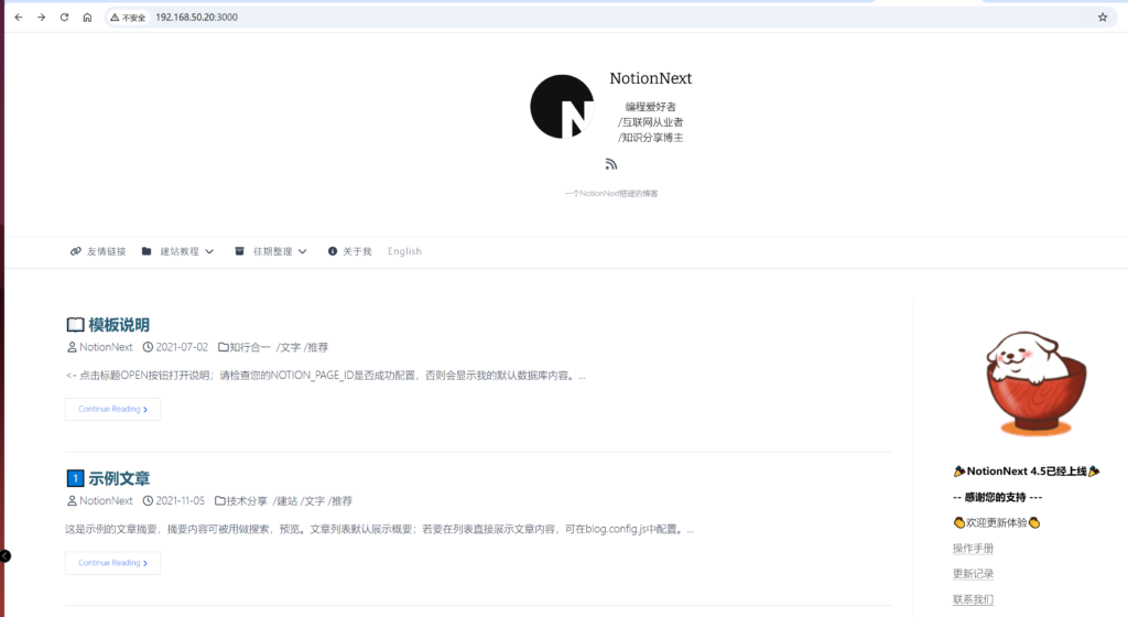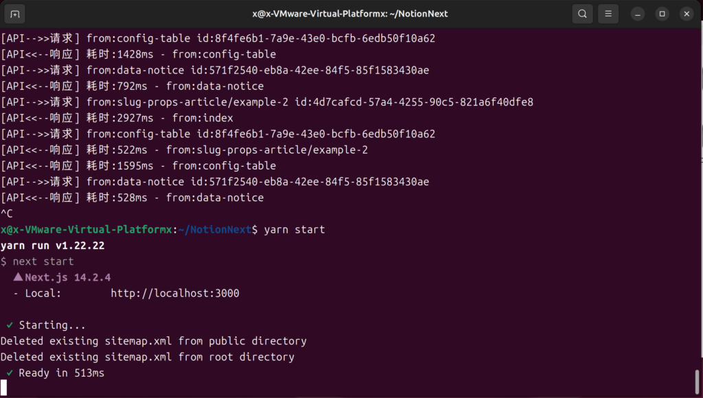 Notion Next调试 伊普兰x | 2024-12-09 23:19 | 711 | 网络碎屑 64 字 | 几秒读完 本着Serv00空间支持NodeJS,网上查询了相关的github意外发现一个非常好看的博客主题调用Notion。 安装了虚拟机Ubuntu,安装了NodeJS以及yarn 成功截图发一下